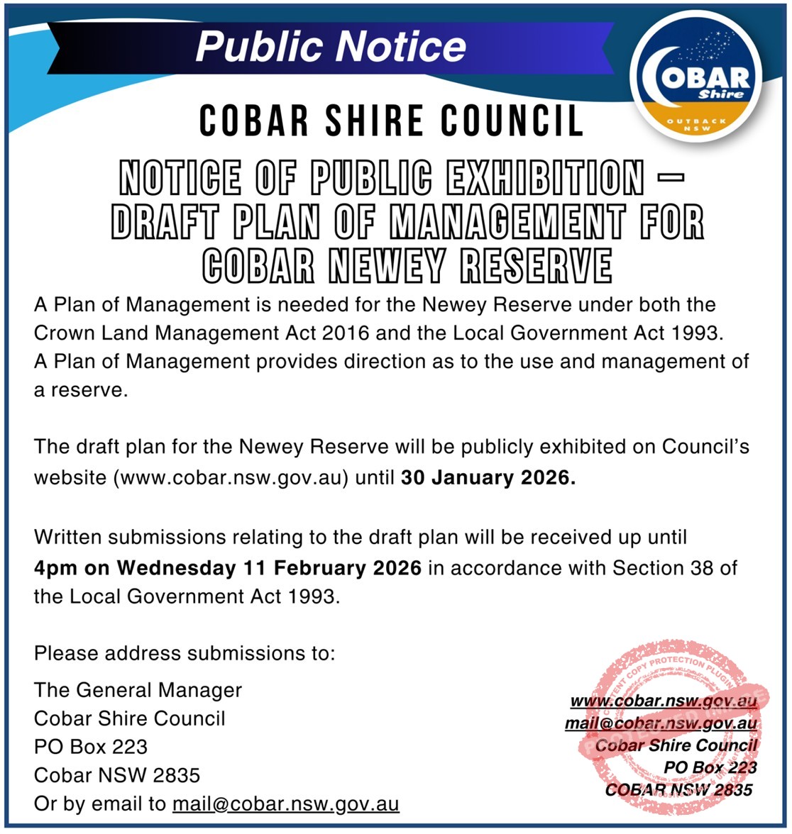 Cobar’s Australia Day Ambassador, TV and radio commentator, Peter Wilkins and Mayor Jarrod Marsden presented Colby Lawrence with the Citizen of the Year Award at Monday’s Australia Day celebrations at the Cobar Memorial Swimming Pool. Cobar’s Australia Day Ambassador, TV and radio commentator, Peter Wilkins and Mayor Jarrod Marsden presented […]
