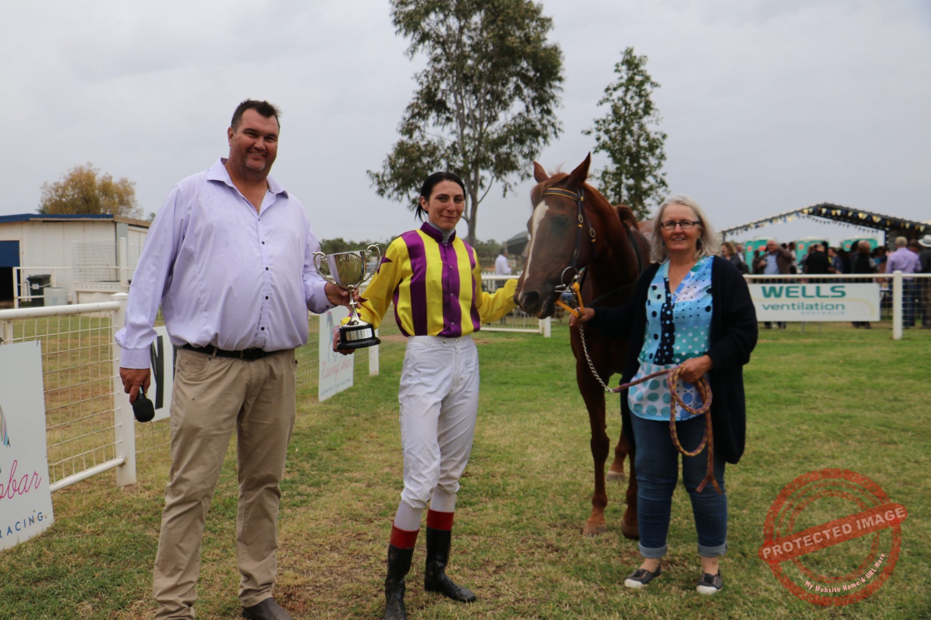 a print Cobar Races WestTrac Cup presentation Jarrod Marsden with jockey Chelsea Ings and strapper Cindy Monaghan (169)